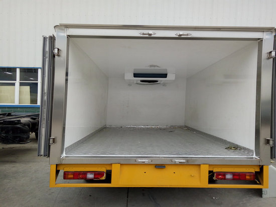 冷藏車廂體:采用國標A級聚氨酯保溫材料,厚度為8厘米,廂體內(nèi)外采用玻璃鋼材質(zhì)全包裹。不銹鋼鎖件。包角、包邊鋁合金型材。底盤采用高強度花紋鋁板定制。可選裝肉鉤導軌,和底部通風槽。廂體材質(zhì)為內(nèi)外玻璃鋼,中間夾層采用5個厚聚氨酯發(fā)泡隔熱材料,廂體一次成型,底板為花紋鋁板,門框邊飾全不銹鋼件,后門雙開。
