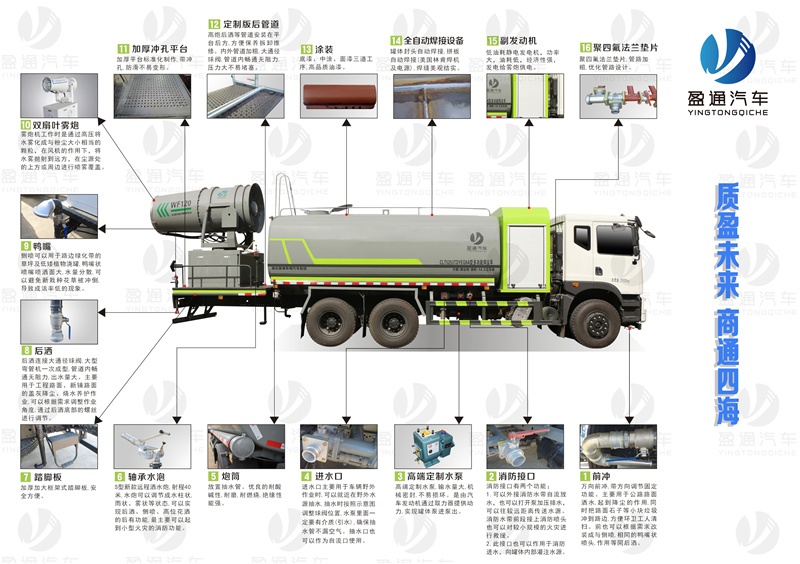 天龍23方霧炮車_東風天龍霧炮車_國六23方霧炮車_天龍23方水罐車_湖北盈通專用汽車有限公司,該車用途為抑塵降霾,主要裝置為罐體及噴霧裝置;隨底盤選裝駕駛室;罐體總容量:18.6立方米,罐體有效容積:17.75立方米,罐體外形尺寸(×長軸×短軸)(mm):6700×2450×1650;側后防護情況:側、后防護材料均為:Q235碳鋼,連接方式均為:螺栓連接,后部防護截面尺寸(mm):120×50,后部防護離地高度(mm):480;ABS型號/生產廠家:3631010-C2000/東科克諾爾商用車制動系統(十堰)有限公司,ABS 8/東科克諾爾商用車制動系統(十堰)有限公司,4460046450/威伯科汽車控制系統(中國)有限公司.選裝噴霧裝置樣式,選裝擋泥板樣式。選裝限速裝置,限速89km/h.選裝蓄電池及儲氣筒左側布置.選裝擋泥板樣式,選裝后部樣式,選裝水炮支架位置,選裝弧形噴灑裝置,選裝箭頭燈裝置。