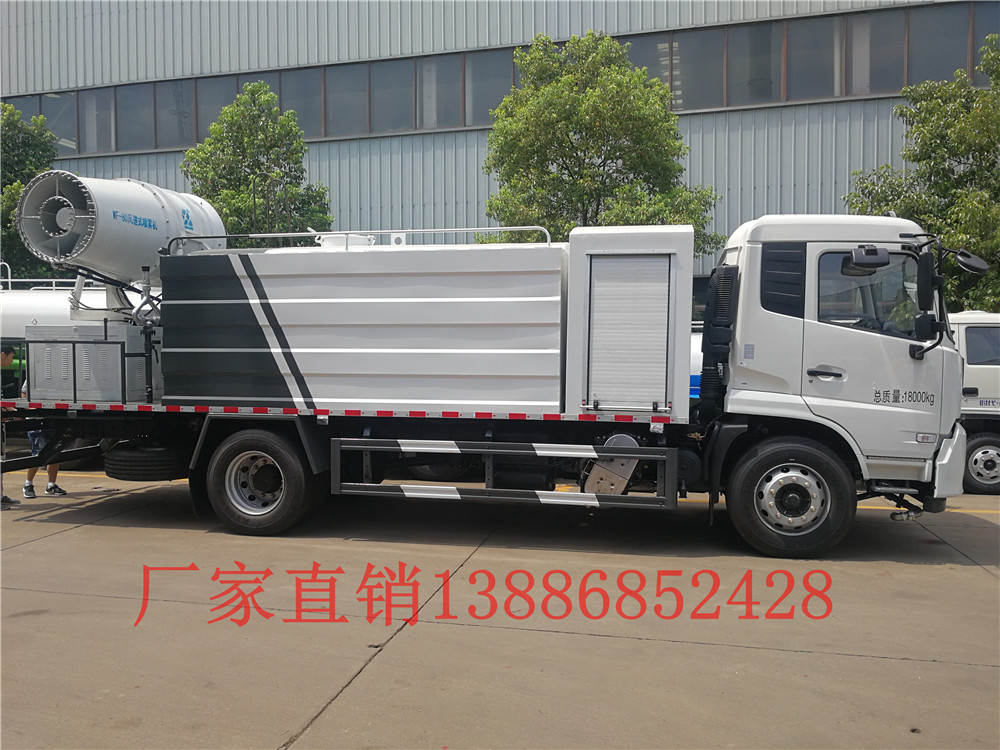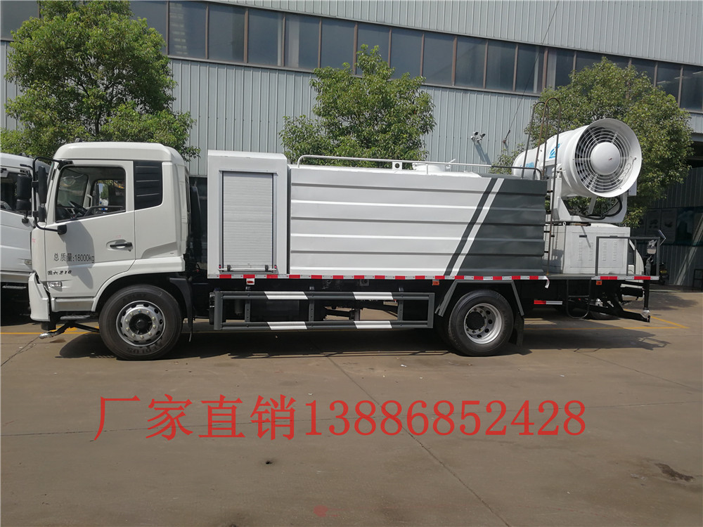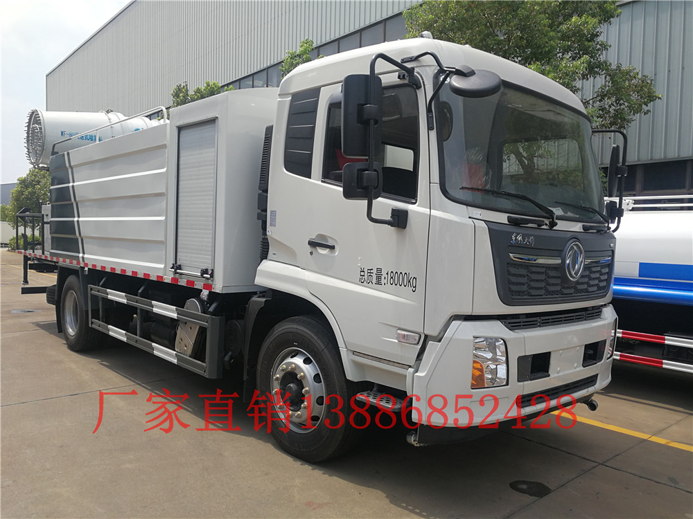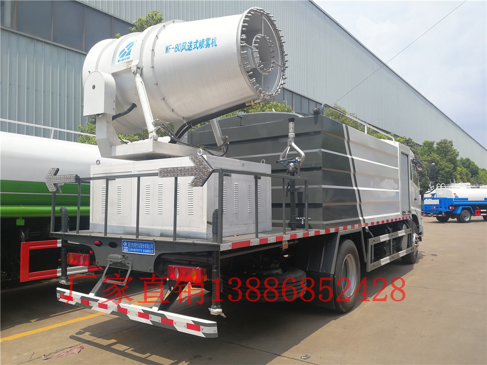 東風(fēng)天錦12噸灑水車CLW5180GSSYT6,搭配30米霧炮機(jī),可遙控或人工控制,并可隨意調(diào)解水平旋轉(zhuǎn)及噴霧角度,使用安全可靠;霧炮機(jī)是根據(jù)風(fēng)送原理,先使用進(jìn)口高壓泵、微細(xì)霧化噴嘴將水霧化,再利用風(fēng)機(jī)風(fēng)量和風(fēng)壓將霧化后的水霧送到較遠(yuǎn)距離,使得水霧到達(dá)較遠(yuǎn)距離同時(shí)能夠覆蓋更大面積,水霧與粉塵凝結(jié)后降落,從而達(dá)到降塵目的。