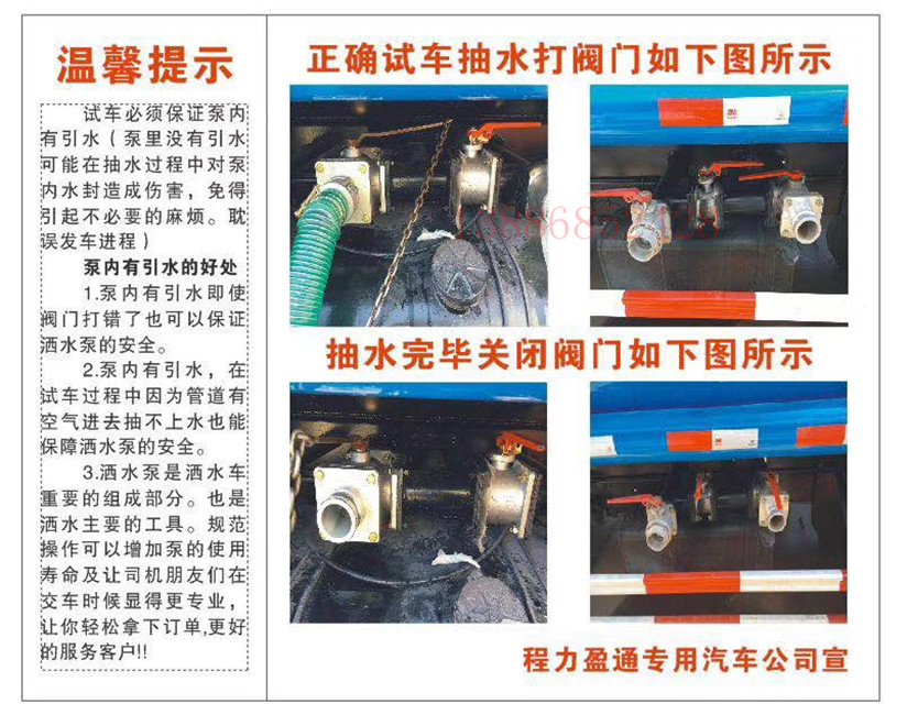 灑水車車載水泵的正常使用和常規保養,遇到上述問題仍然解決不了的,請致電13886852428,我們將用專業的服務水準為你免費解決所有問題。