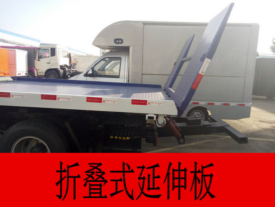 1.平板長度為:4.2米加上0.9米折疊板,寬均為2.35米,3P2A碳鋼板沖壓瓦楞型防滑板,平板帶有鎖止機(jī)構(gòu),平板及后拖臂均為雙側(cè)聯(lián)動(dòng)操作;