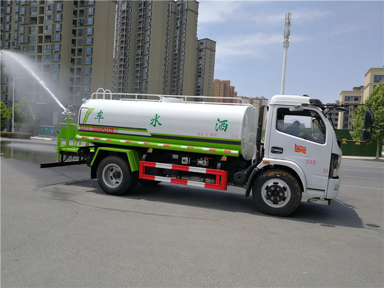 6、灑水車前噴頭位置較低,靠近地面,噴灑壓力較大,可用于沖洗路面;后噴頭位置較高(灑水車后噴頭一般左右各安裝一個),灑水面較寬,可用于公路施工灑水,使用后噴頭時,應將前噴管關閉;使用可調噴頭灑水時,灑水寬度可根據需要調整。灑水寬度越寬,中間重疊量越少,灑水密度越均勻。